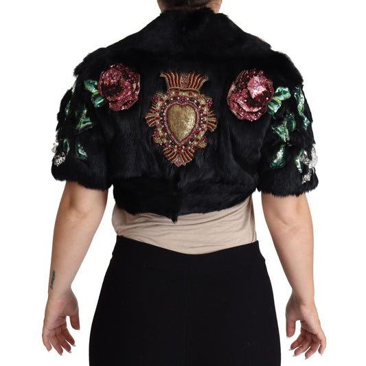 Dolce & Gabbana Black Rabbit Fur Crystals Sequin Coat